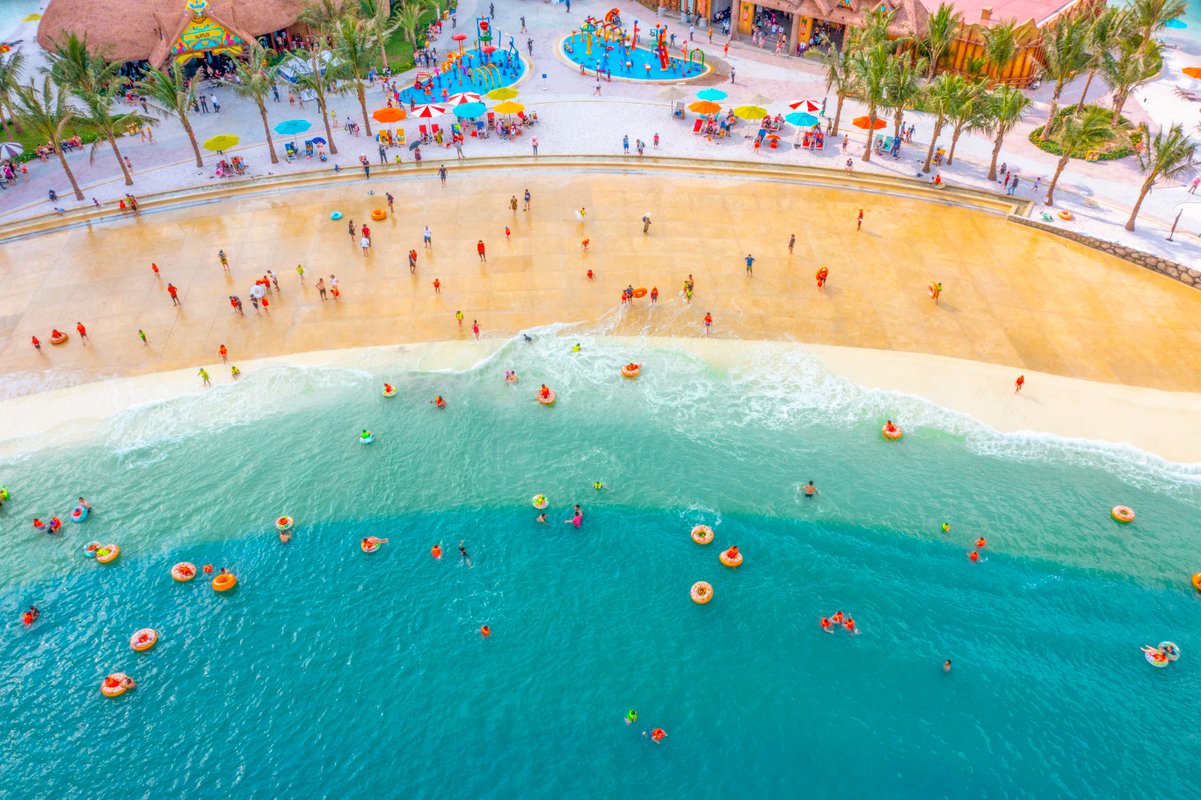 Khu biển tạo sóng nhân tạo là trái tim của VinWonders Wave Park, mô phỏng cảm giác biển thật với cát, sóng và không gian rộng mở.